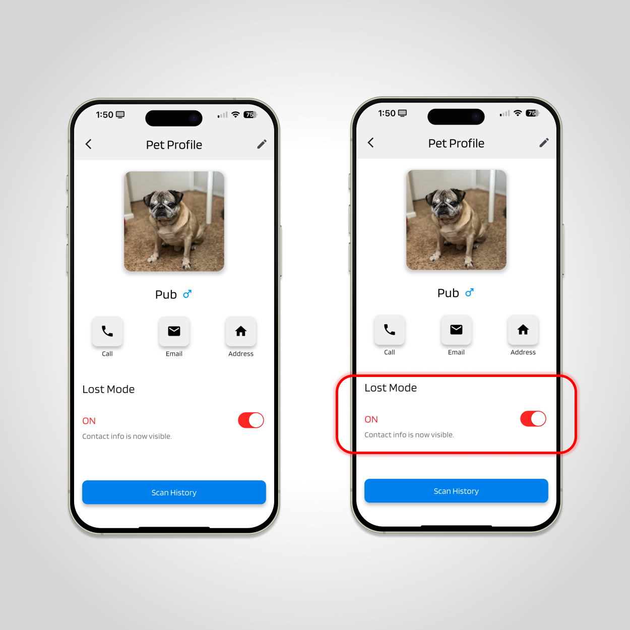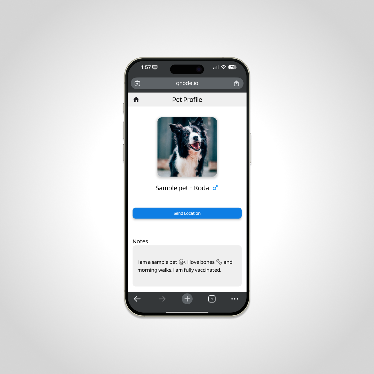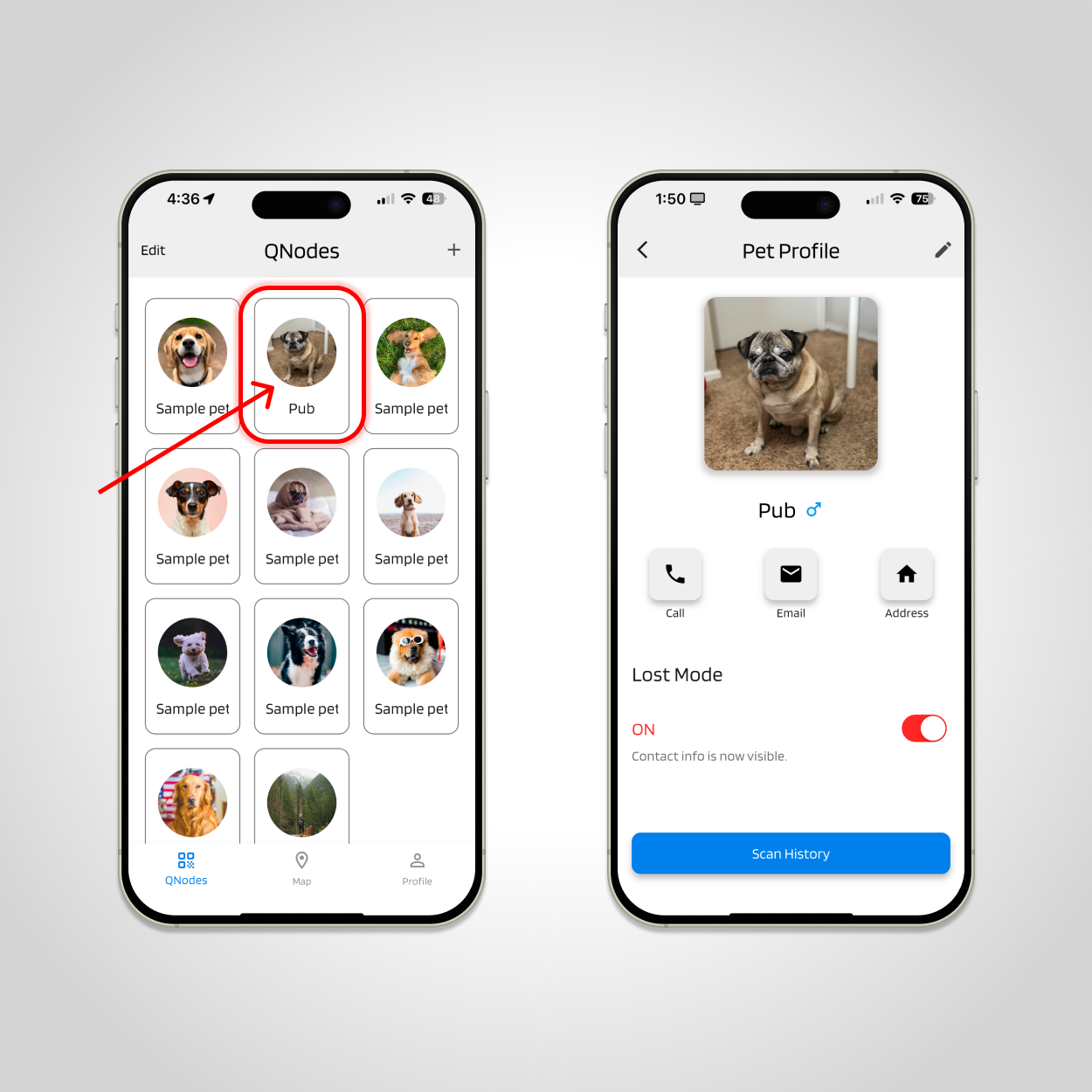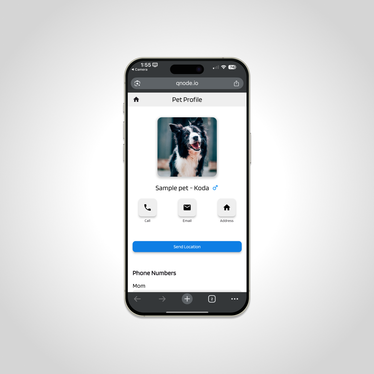 When ON, your phone numbers, email addresses, home address and all your default pet info will be visible to the person who scans your pet’s QNode. Makes it perfect for helping you find your pet quickly.