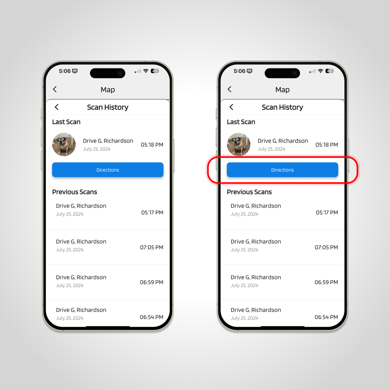 - The Last Scan appears at the top with a "Directions" button that opens Google Maps